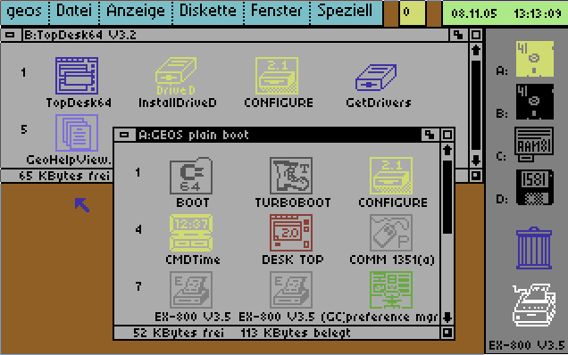 TopDesk was the deskTop replacement on the final "official" version of GEOS (2.5), which was only released in Germany (see Bo Zimmerman's FAQ). It shipped with TopDesk 1.2 (screenshot), which featured movable, resizable windows. This D64 image is a bootable copy (all in German). I've also got a copy of TopDesk 3.2 (screenshot), with four-drive support; here are D64s of topDesk 3.2 and the help system that goes with it (all in German).