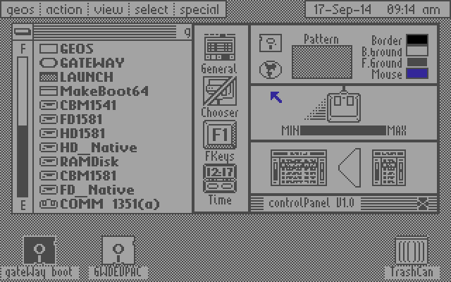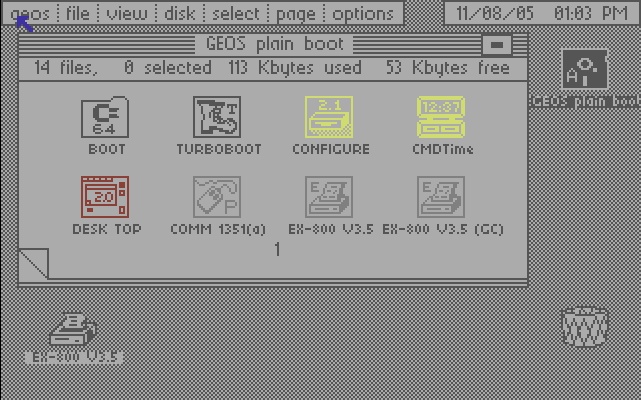 A word about system resources: GEOS pushes the Commodore 64 to its limits as far as hardware and memory usage are concerned; little bits of code and data are constantly being swapped in from disk. You can run it from a single 1541 drive, but you'll be sorry (remember the days of "Bad or missing COMMAND.COM"?). A 1541 and a 1581 or CMD FD are better, and a CMD HD is a joy to use (and well supported). An even faster solution is to get a RAM expansion unit (REU or geoRAM), and set it up as a RAMdisk using the CONFIGURE program. You can work from the RAMdisk and copy your data back to the "real" disk every so often during your session; the speed is really amazing even without an accelerator like the TurboMaster or SuperCPU. If you are using more than one type of drive without a RAM expander, you will need to have a copy of CONFIGURE on every disk that contains the deskTop (see GEOS 2.0 manual, page 27). This is because the disk drivers are normally loaded from CONFIGURE, but if you are using a RAM expander, they are cached there. This is one of the reasons why a RAM expander is strongly recommended to work with GEOS. (If you don't have a real '64 with an REU, the Ultimate 64 implements one of up to 16M. There is also a modern clone of the geoRAM made by GGLABS; a one-megabyte version called GRAM/1D can be found on eBay.)