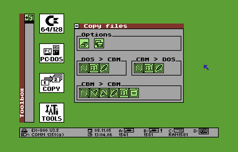 geoDOS is another interesting German deskTop replacement (screenshot). It allows copying between Commodore and DOS-formatted diskettes with on-the-fly file conversion (among many other features). There's a copy of geoDOS in the geoSpecific collection; I extracted the ZIP files, converted the resulting .CVT files to GEOS files, then replaced the German help files with the ones that Bruce Thomas translated. Here's a D81 image of the result.