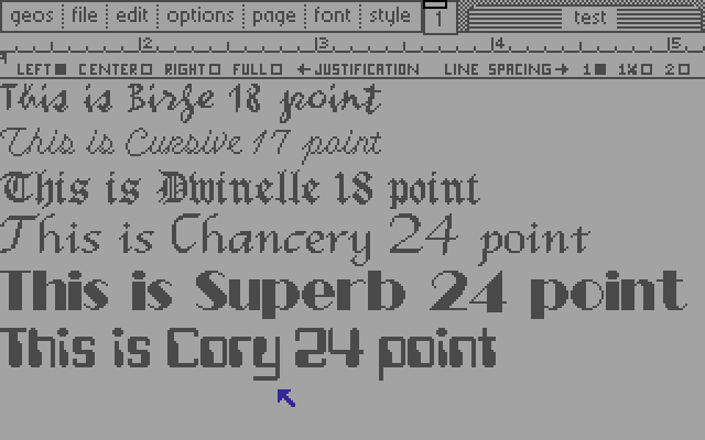 Here's a collection of almost 100 GEOS fonts, in D64 images. If you put more than eight fonts on your geoWrite disk, you'll want to grab the geoWrite disk image above, which contains a desk accessory to choose which eight will appear in the menu.