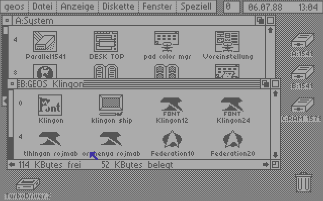 Here's something for Star Trek fans: A D64 image of a GEOS disk containing the Organian Peace Treaty as a geoWrite file... in Klingon (tlhIngan Hol). There's actually a Klingon font on this disk; there's also a nice geoPaint image of a Klingon ship.